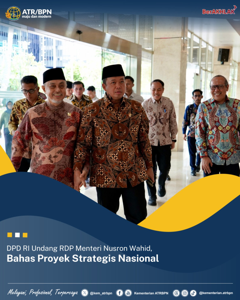 Kajanglako.com, Jakarta - Menteri Agraria dan Tata Ruang/Kepala Badan Pertanahan Nasional (ATR/BPN), Nusron Wahid akan bertemu dengan Dewan Perwakilan Daerah Republik Indonesia (DPD RI) di Gedung B DPD RI, Jakarta pada Kamis (28/11/2024). Agendanya, Menteri Nusron akan memaparkan beberapa progres dan capaian terkait Proyek Strategis Nasional (PSN).