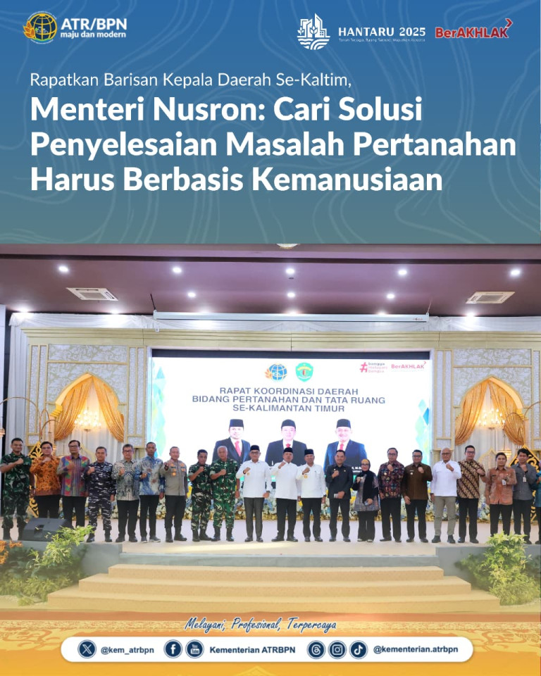 “Kami mencari solusi yang berbasis kemanusiaan, tidak berbasis hukum. Karena kalau berbasis hukum itu kalah-menang, benar-salah. Kami tidak menggunakan rumus ini. Rumus yang kami pakai adalah rumus kemanusiaan supaya _win-win solution_. Rakyatnya tidak dirugikan, tapi negara tetap mencatatkan bahwa itu tetap adalah aset negara,” ujar Menteri Nusron usai memimpin Rakor yang berlangsung di Pendopo Odah Etam, Kantor Gubernur Kaltim, di Samarinda pada Jumat (24/10/2025).